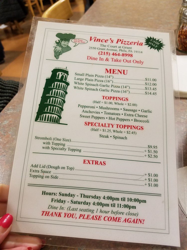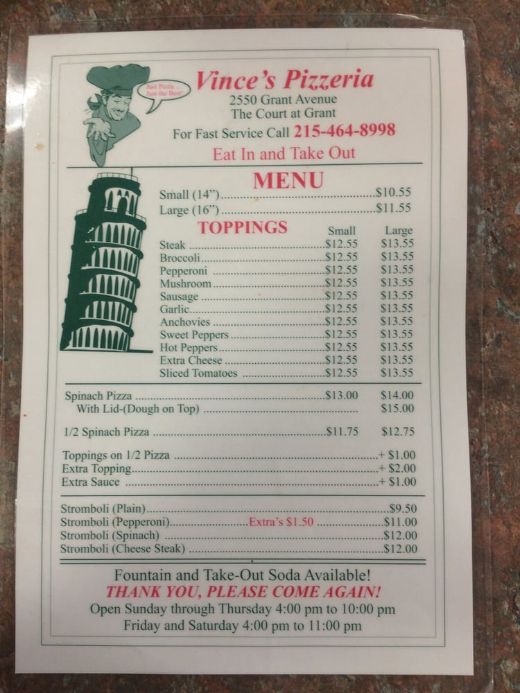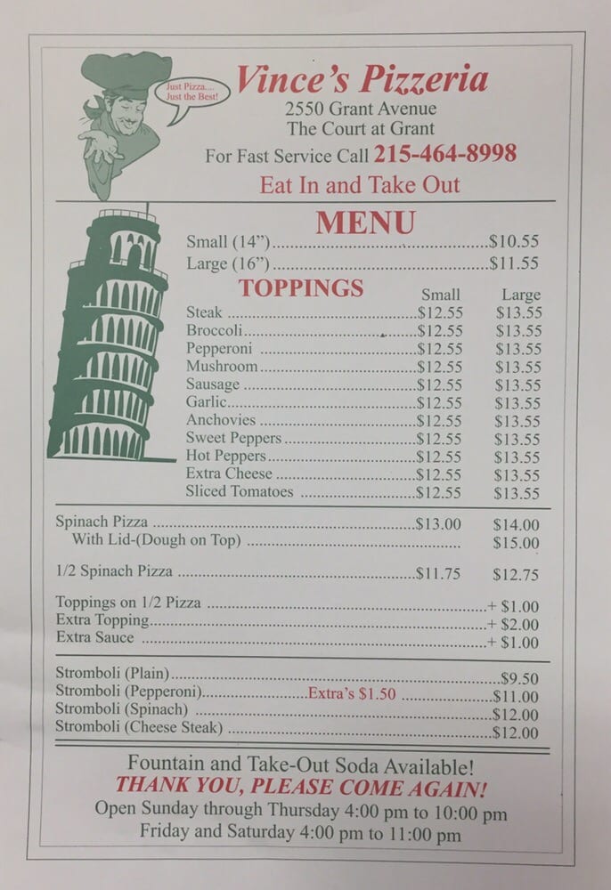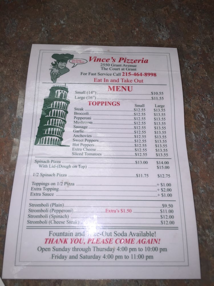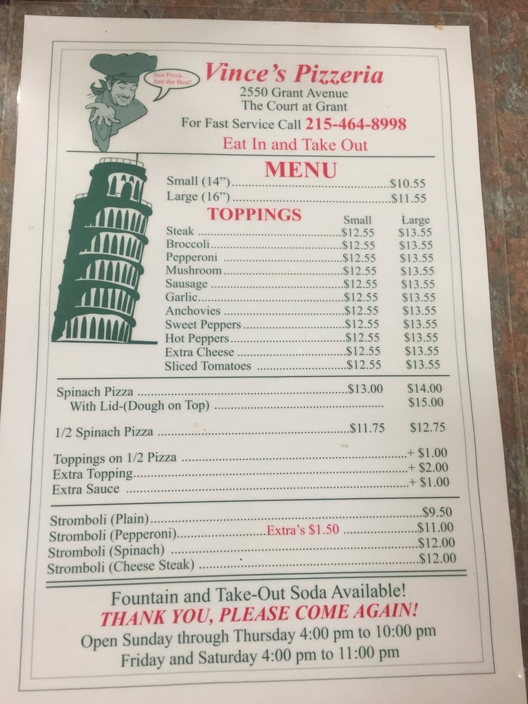 Vince’s Pizzeria, located in Philadelphia, offers a variety of pizzas and stromboli with options for toppings like steak, broccoli, and pepperoni. Customers have praised the exceptional service and delicious food, with one reviewer even comparing it to a legendary pizza joint. The unique sauce- on-top, cheese-on-the-bottom style creates a crunchy and flavorful pizza experience. While some found the sausage too salty, most customers rave about the quality and taste of the dishes. The welcoming atmosphere and quick service add to the overall dining experience. Vince’s Pizzeria seems to have garnered a loyal following for its outstanding food and genuine customer care.