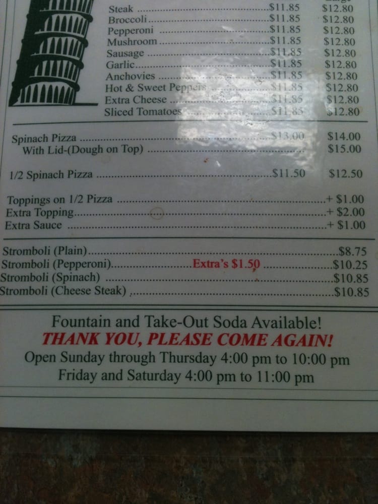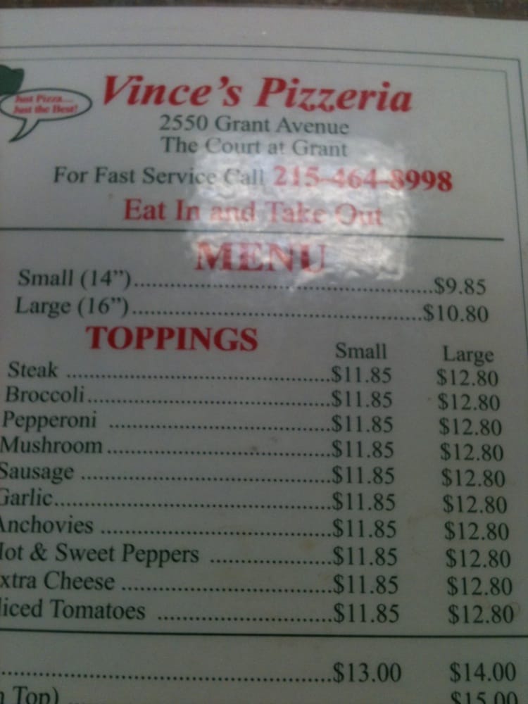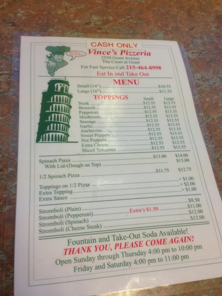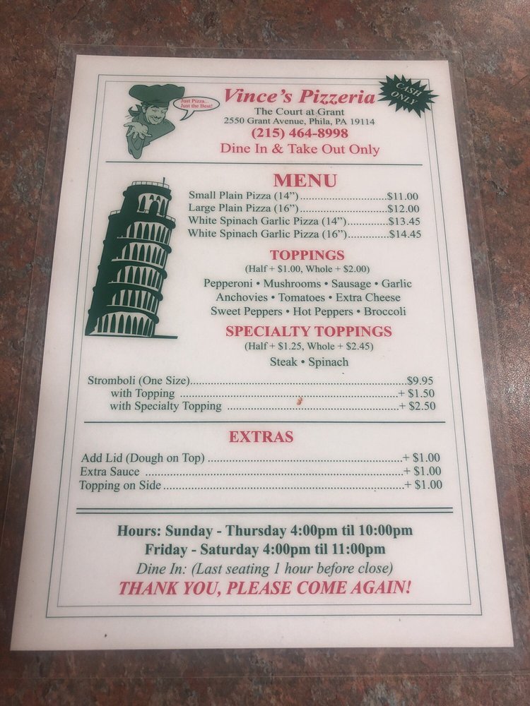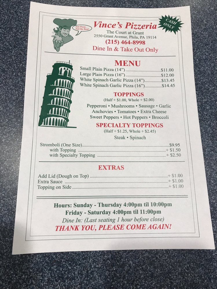 Vince’s Pizzeria, located in Philadelphia, offers a variety of pizzas and stromboli with options for toppings like steak, broccoli, and pepperoni. Customers have praised the exceptional service and delicious food, with one reviewer even comparing it to a legendary pizza joint. The unique sauce- on-top, cheese-on-the-bottom style creates a crunchy and flavorful pizza experience. While some found the sausage too salty, most customers rave about the quality and taste of the dishes. The welcoming atmosphere and quick service add to the overall dining experience. Vince’s Pizzeria seems to have garnered a loyal following for its outstanding food and genuine customer care.